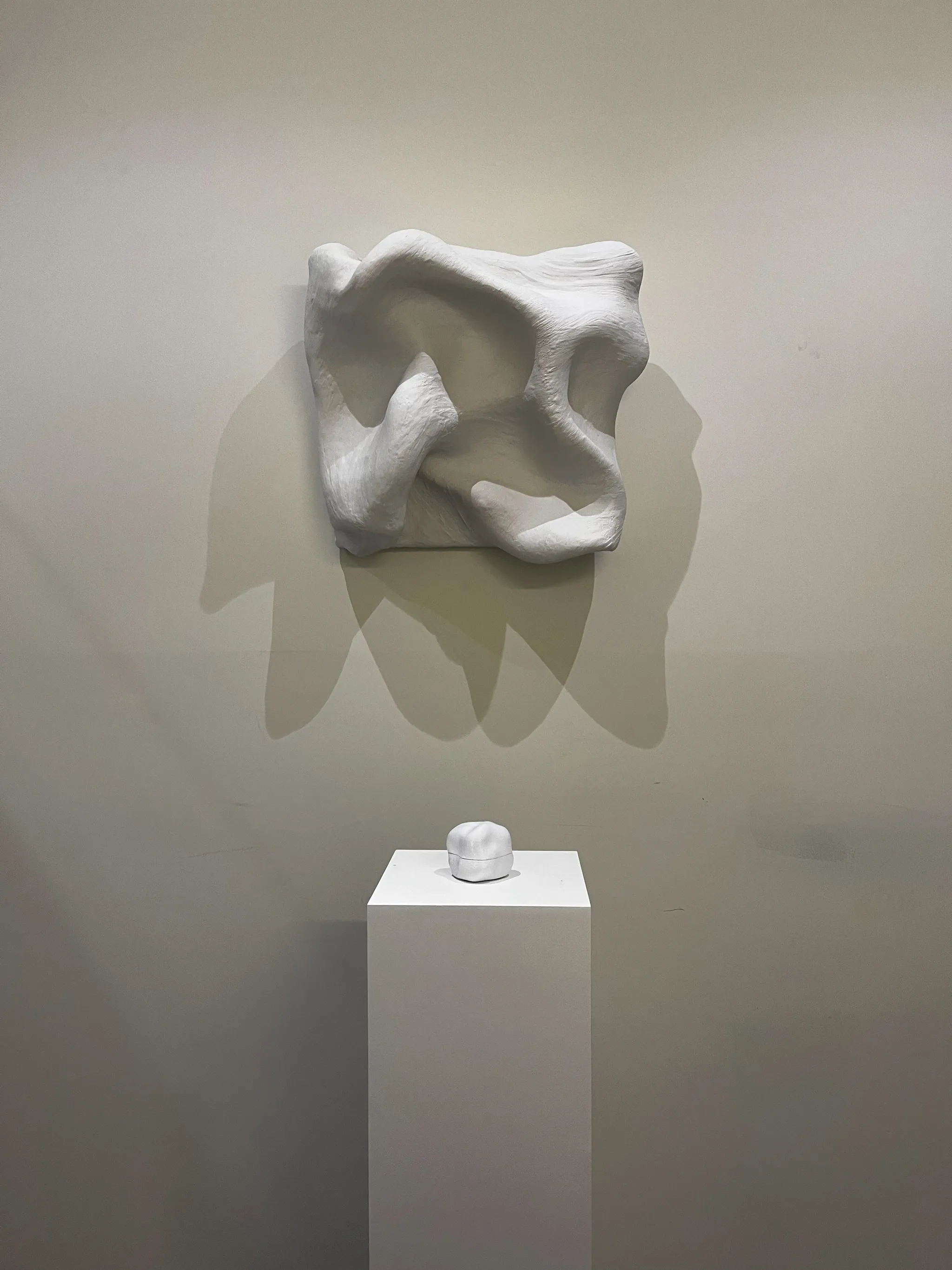 이 작업은 두 개의 조형으로 이루어져 있습니다. 테이블 위 구조 조형은 의식의 층, 즉 보이지 않는 신뢰와 무의식, 그 위에 얽혀 있는 생각과 감정의 구조를 입체적으로 드러냅니다. 옆에 놓인 화장품 제형 유체조형은 그 보이지 않는 구조가 현실 속에서 흐름과 촉감, 피부의 감각으로 드러난 결과를 보여줍니다.