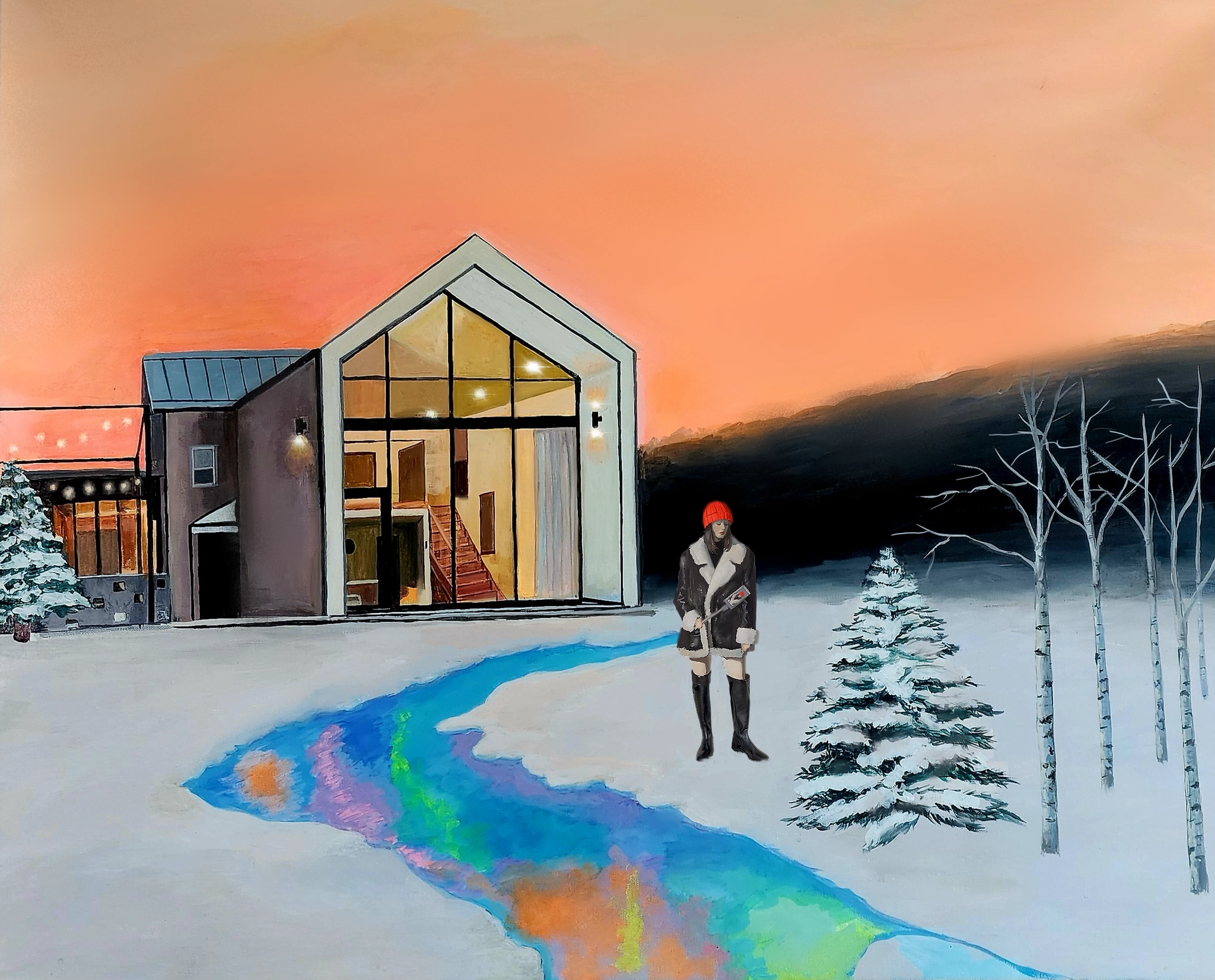 대비의 미학 : 차가운 설원과 타오르는 저녁 노을, 그리고 집 안의 노란 온기를 대비시켜 고립 속의 안도감을 표현했습니다.