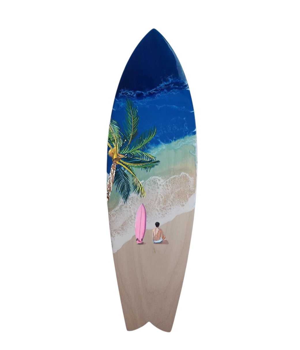 “이 작품은 피쉬 테일 서핑보드 형태를 캔버스 삼아, 푸른 바다와 모래사장의 평화로운 풍경을 담아낸 감각적인 레진 아트입니다. 파도의 하얀 거품을 입체적으로 표현한 레진 레이싱 기법과 상단의 깊은 네이비 색감이 실제 바다를 보는 듯한 청량감을 줍니다. 해변에 앉아 파도를 기다리는 서퍼와 핑크색 보드 그림은 '보드 속의 보드'라는 재미있는 설정과 함께 여유로운 휴식을 상징합니다. 나무 본연의 질감을 살린 하단부와 화려한 바다 색상의 대비가 조화로워, 어느 공간에나 잘 어울리는 세련된 인테리어 오브제입니다.