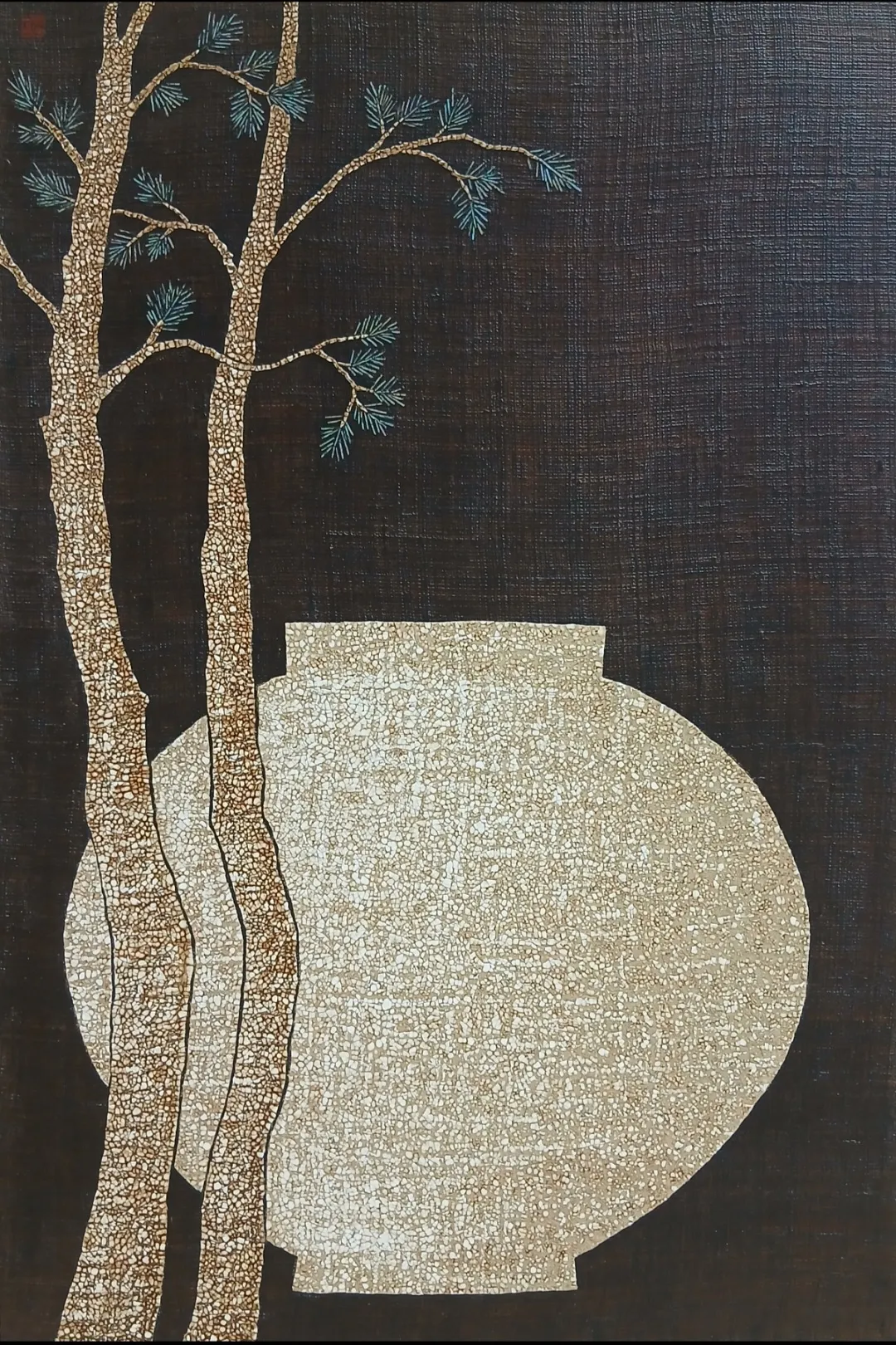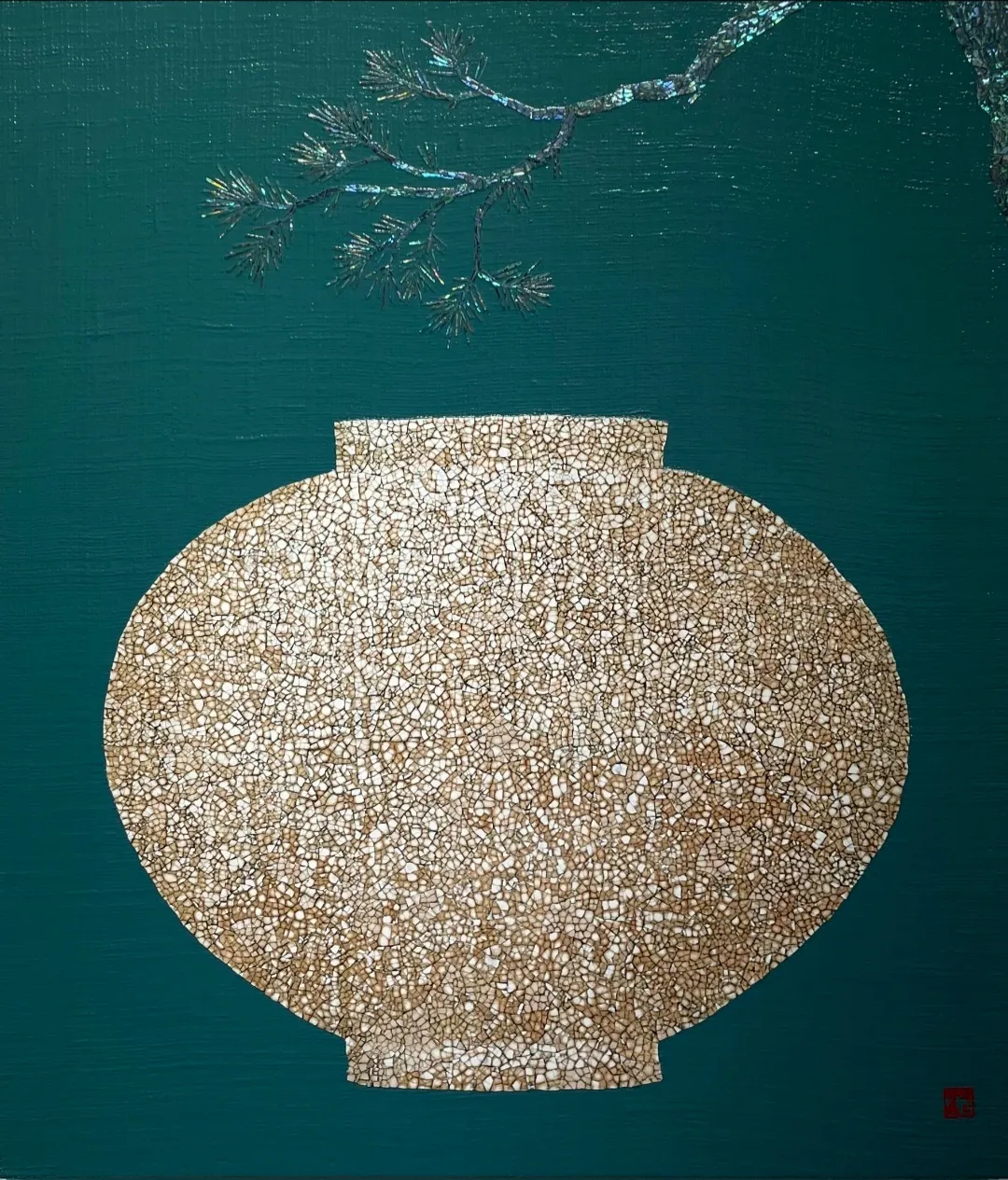 청록의 유색 옻빛 위에 달항아리가 고요히 자리한다. 달항아리는 미세한 균열과 질감 속에 시간의 결이 스며든다. 그 위로 자개로 표현된 소나무의 빛이 은은하게 번지며 화면 깊숙이 스며든다.