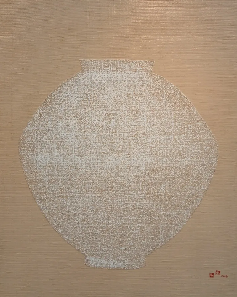 소나무의 강인한 생명력과 달항아리의 고요한 충만이 한 화면에 머문다. 옻빛의 시간은 겹겹이 스며들어, 보이지 않는 염원을 드러낸다. 채움과 비움, 자연과 존재가 경계 없이 이어지는 순간.