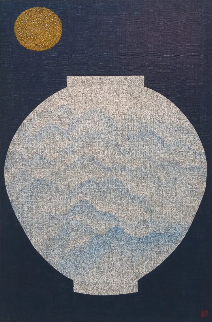 산수의 흐름과 달항아리의 고요한 형태가 한 화면에 겹쳐진다. 옻빛의 깊이 속에서 자연과 시간, 그리고 염원이 은은히 스며든다. 비움과 채움이 교차하는 자리에서, 풍경은 내면의 풍경으로 확장된다.